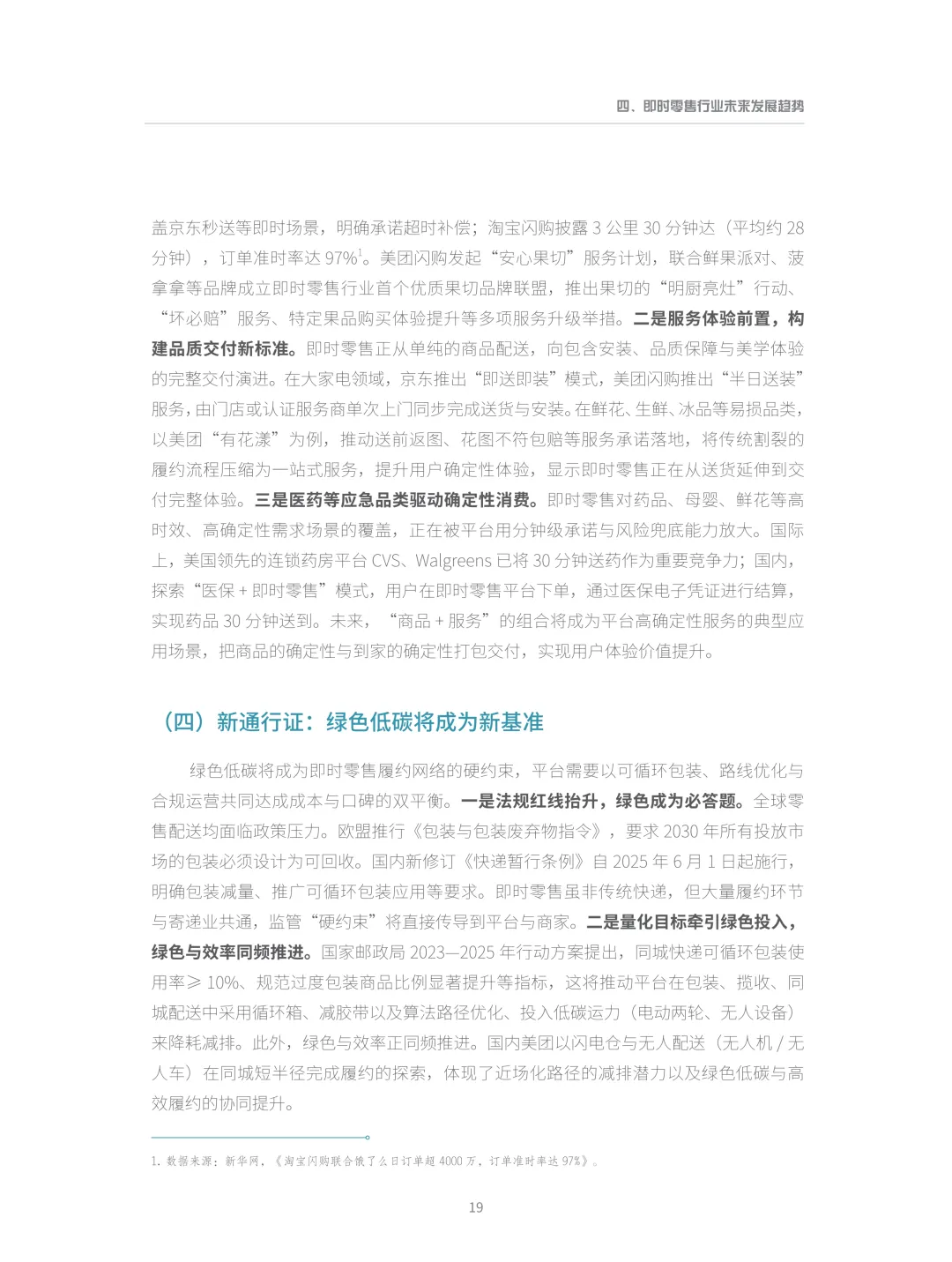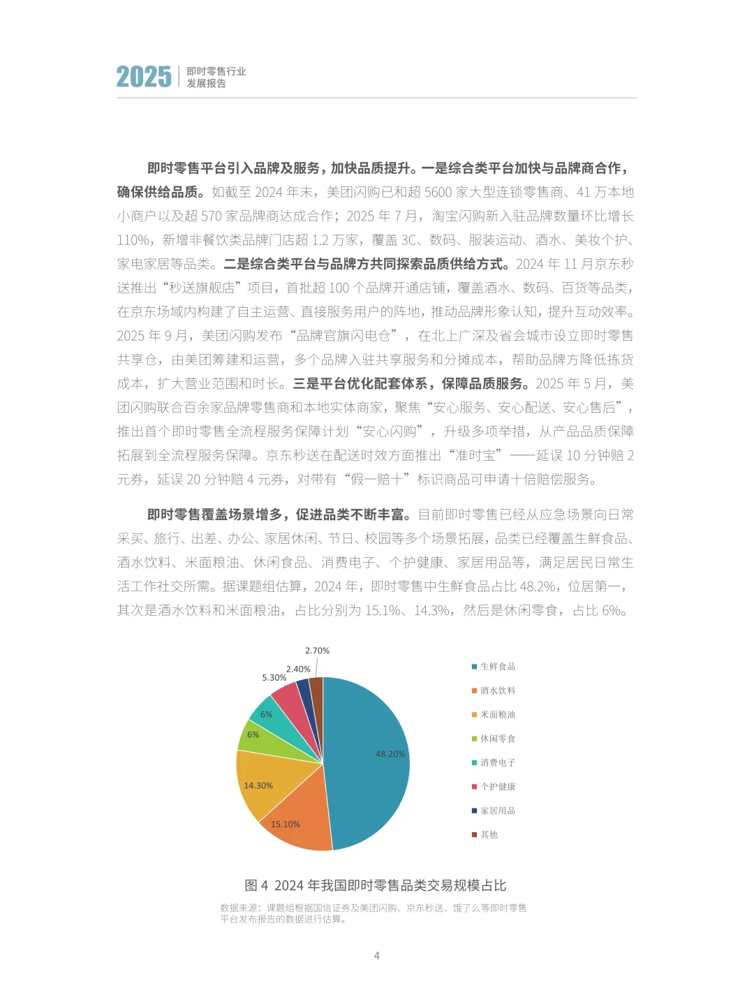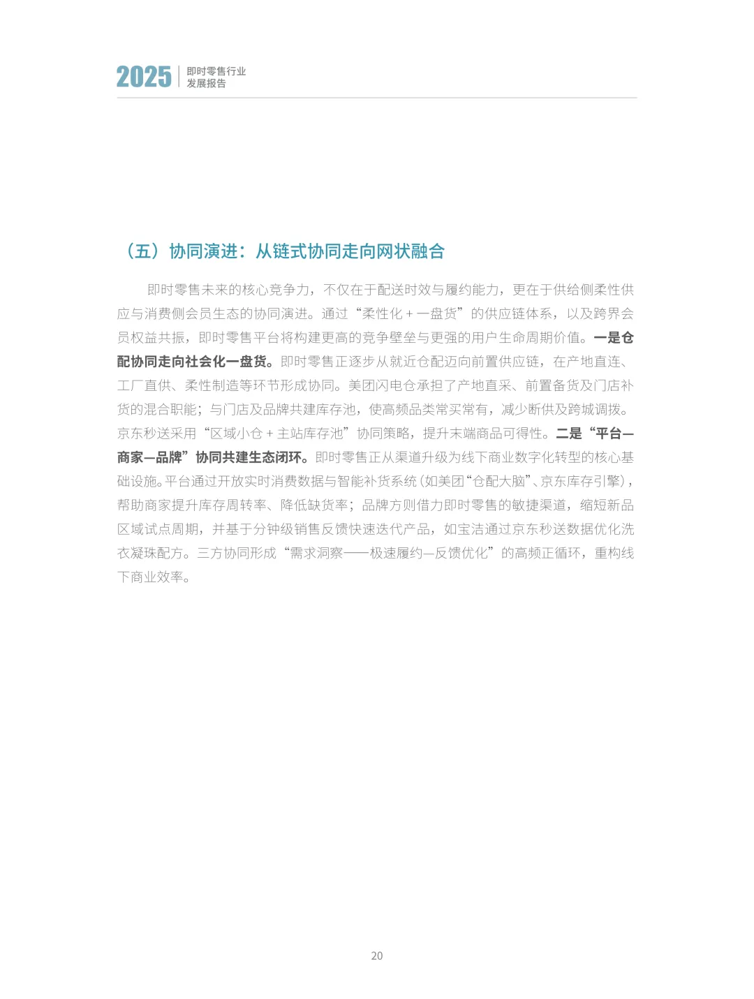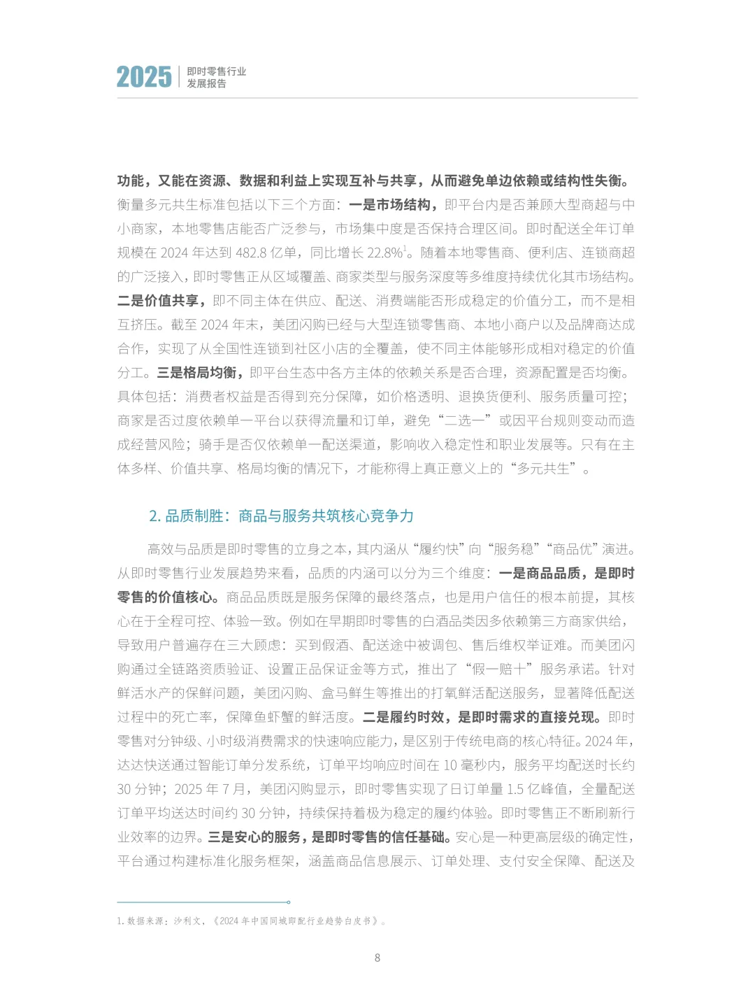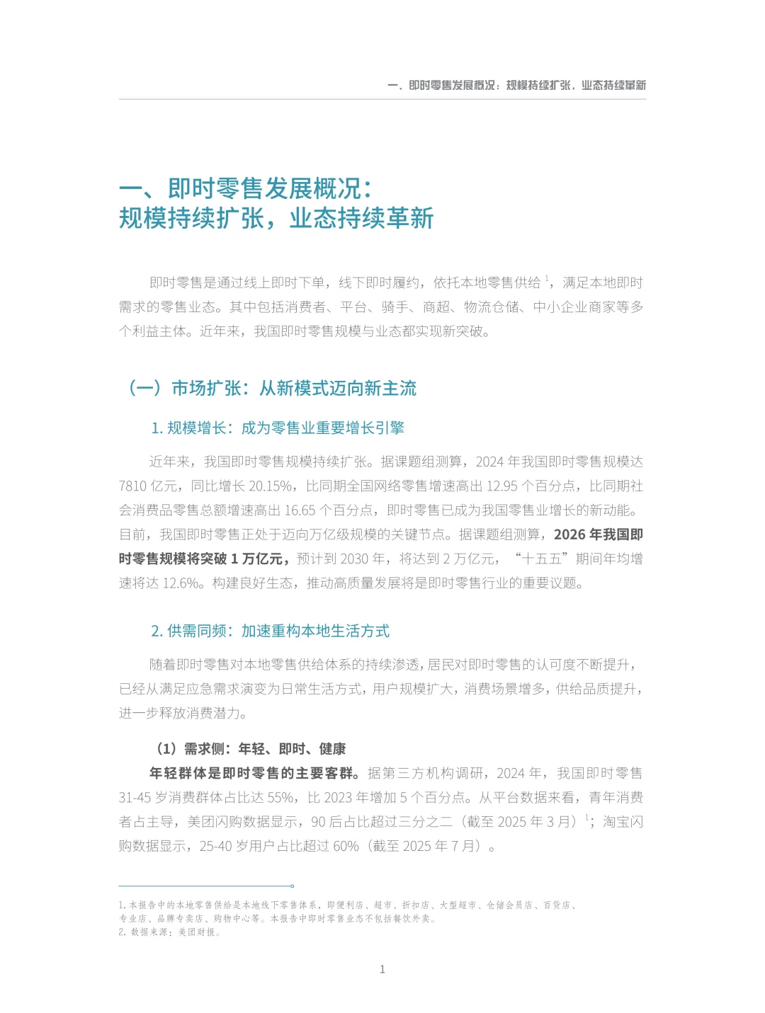 2024 年行业规模达 7810 亿元,同比增 20.15%,2025 年预计至 9714 亿元,2026 年将破万亿、2030 年达 2 万亿元;需求侧以 31-45 岁群体为核心,用户对极速配送、健康产品需求突出,80% 愿为健康产品支付溢价;供给侧前置仓规模化发展,平台与品牌深度合作丰富品类、提升品质,生鲜食品为核心品类(占比 48.2%),同时行业完成平台升级、场景深融、“下沉 + 出海” 的业态革新,头部平台纷纷独立即时零售品牌,县域市场成为增量引擎,海外布局也已起步。 - 2.行业生态:进入高质量发展阶段,明确衡量标准与实现支柱