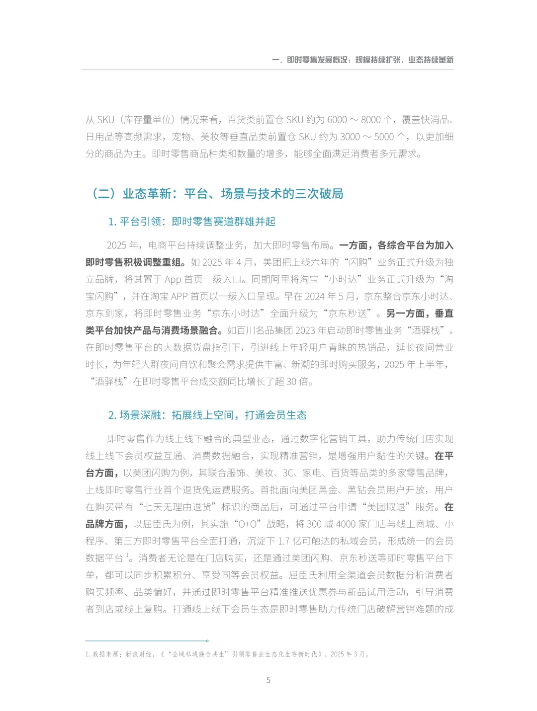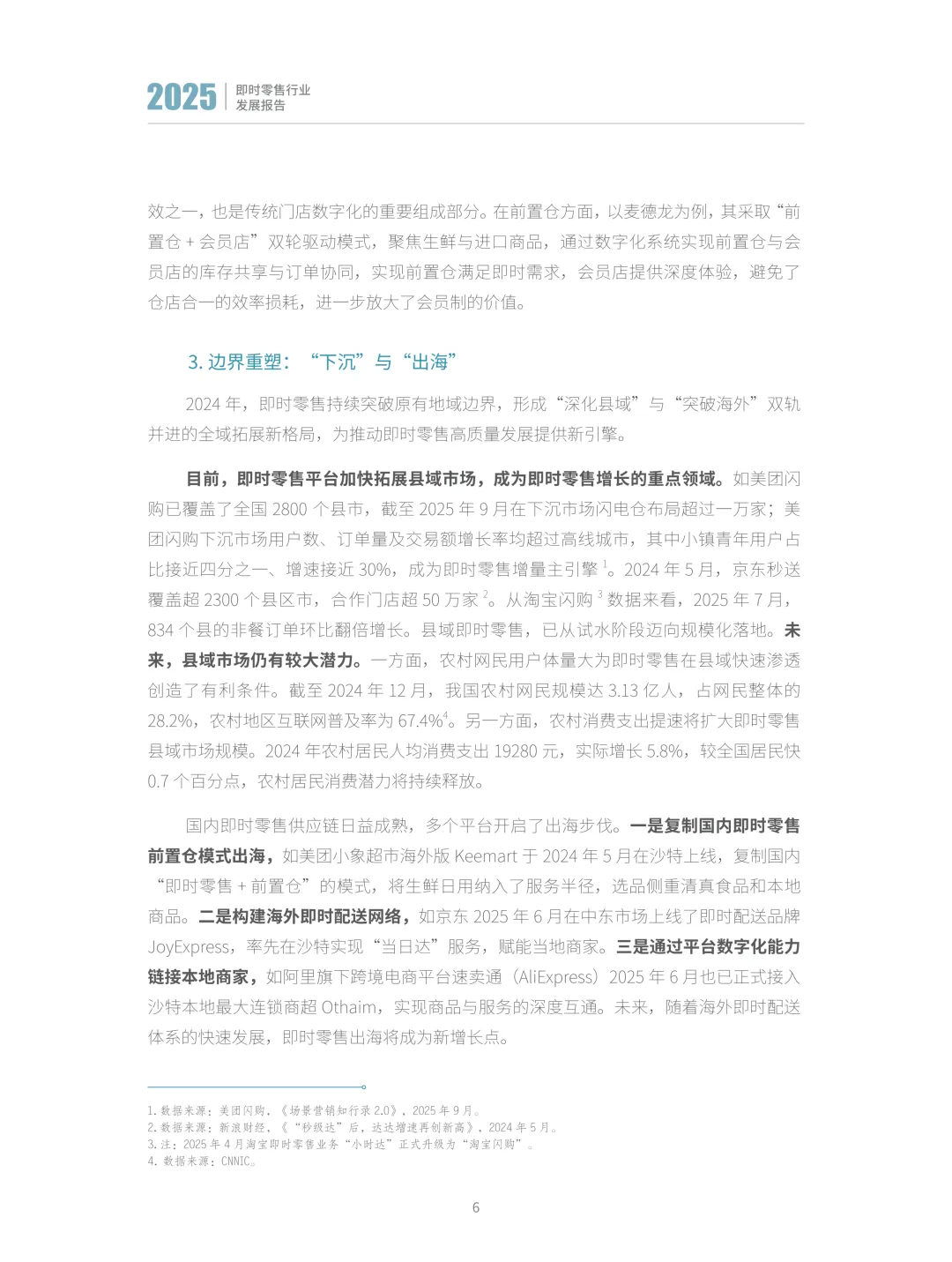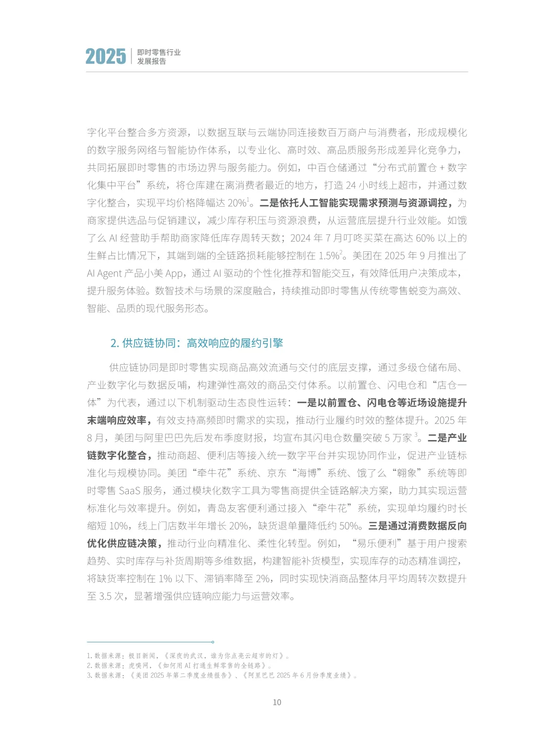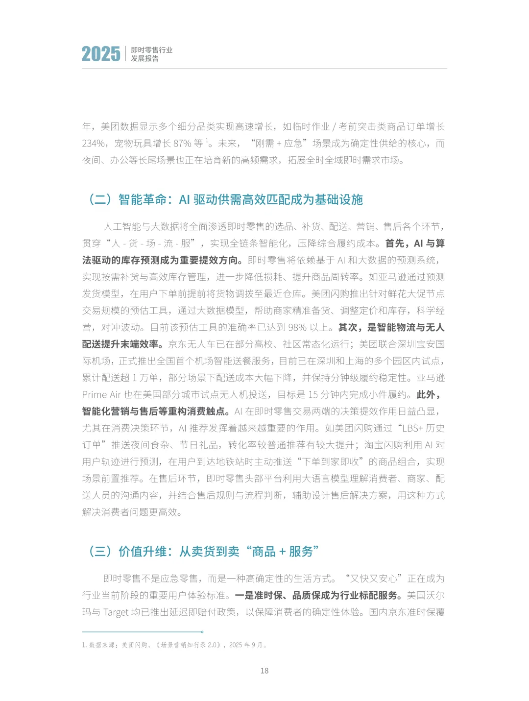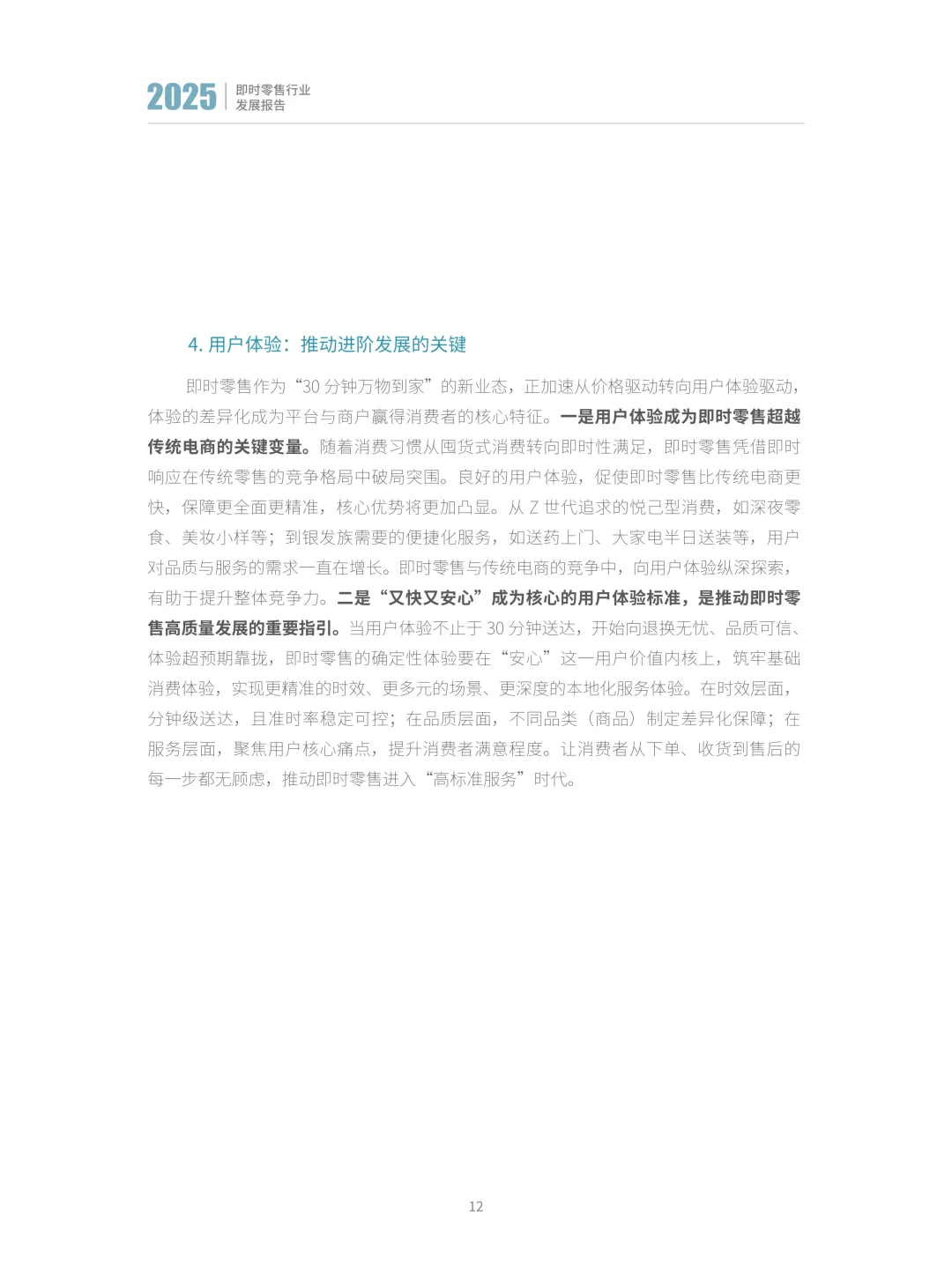 2024 年行业规模达 7810 亿元,同比增 20.15%,2025 年预计至 9714 亿元,2026 年将破万亿、2030 年达 2 万亿元;需求侧以 31-45 岁群体为核心,用户对极速配送、健康产品需求突出,80% 愿为健康产品支付溢价;供给侧前置仓规模化发展,平台与品牌深度合作丰富品类、提升品质,生鲜食品为核心品类(占比 48.2%),同时行业完成平台升级、场景深融、“下沉 + 出海” 的业态革新,头部平台纷纷独立即时零售品牌,县域市场成为增量引擎,海外布局也已起步。 - 2.行业生态:进入高质量发展阶段,明确衡量标准与实现支柱