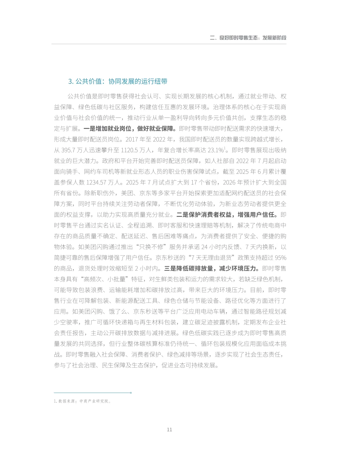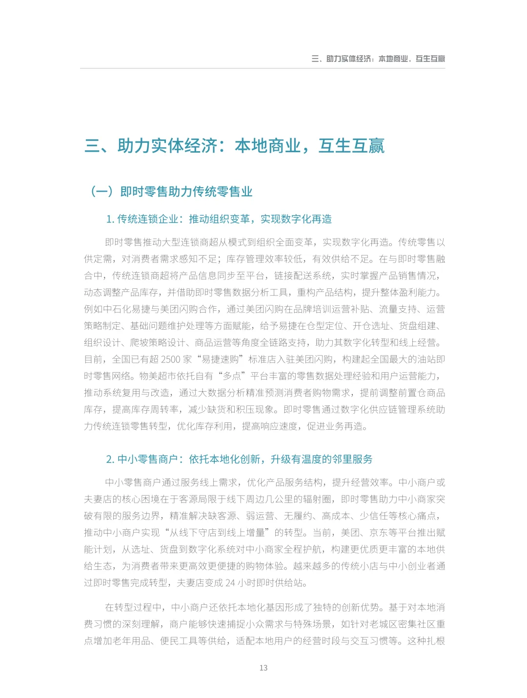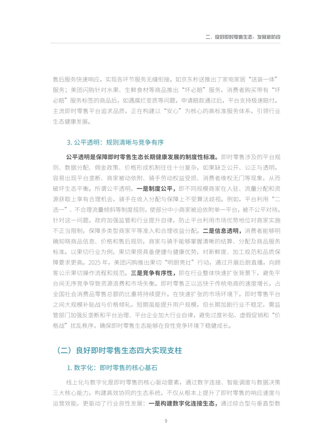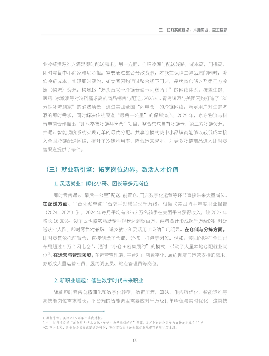行业竞争从价格战转向以用户体验为中心的生态构建,从 “履约快” 升级为 “服务稳、商品优、体验安心” 的多维竞争,“安心” 成为核心竞争力衡量标准。良好的即时零售生态需满足多元共生、品质制胜、公平透明三大衡量标准,依托数字化、供应链协同、公共价值、用户体验四大实现支柱,通过多主体协同、全流程品质保障、清晰规则体系,结合数字技术、高效供应链、社会价值创造和极致用户体验,构建健康可持续的生态体系。 - 3.实体经济价值:多维度赋能,实现互生互赢