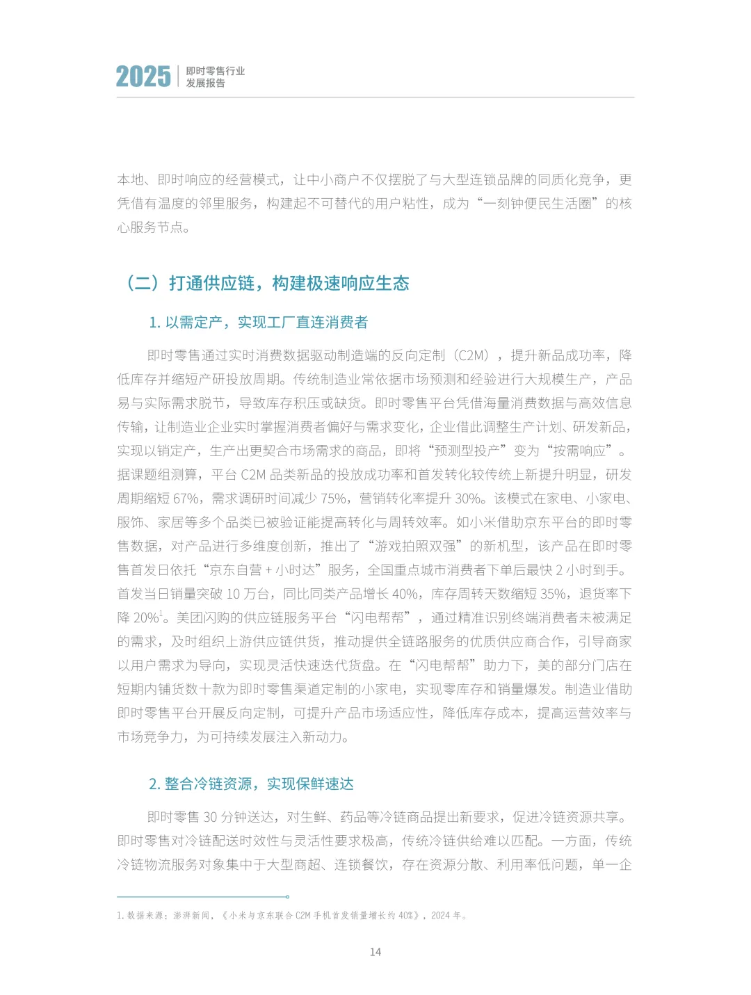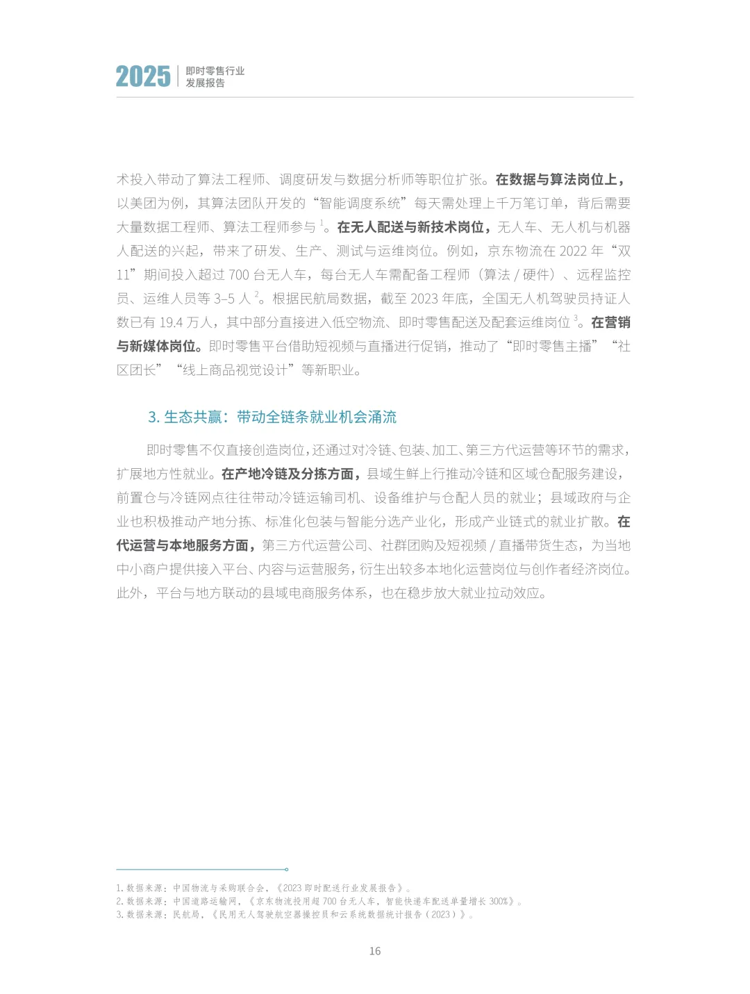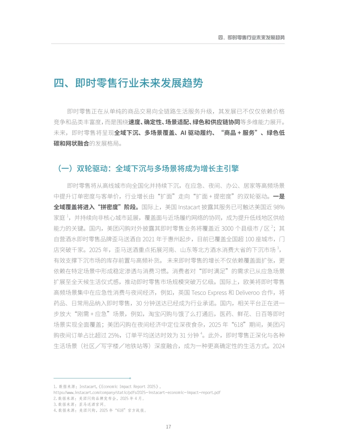 助力传统零售业转型,推动大型连锁商超组织变革与数字化再造,赋能中小零售商户突破客源边界,转型为社区服务节点;通过以需定产实现工厂直连消费者(C2M 模式使新品研发周期缩短 67%)、整合冷链资源实现保鲜速达,重构供应链价值链;同时成为就业新引擎,孵化骑手、团长等灵活就业岗位,催生算法工程师、无人机运维等新职业,带动冷链、包装等全链条就业机会,2024 年美团月均骑手达 336.3 万名,即时配送员规模超千万。 - 4.未来趋势:五大方向引领,行业持续升级
