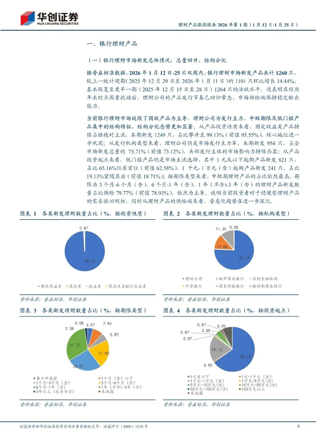 1264 只的活跃水平。这表明在经历年末时点因素扰动后,理财公司的产品发行节奏已回归常态,市场供给端保持稳定输出能力。当前银行理财市场延续了固收产品为主导、理财公司为发行主力、中短期限及低门槛产品集中的结构特征,结构分化态势更加显著。