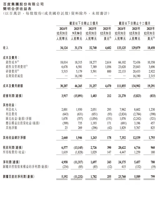 值得注意的是,百度经营现金流在2025年下半年转正,合计产生39亿元人民币现金流,较上半年的负值显著改善,显示核心业务造血能力正在恢复。
