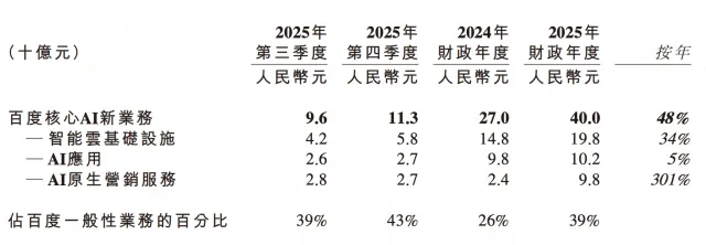 财报显示,百度2025年第四季度实现营收327.4亿元人民币,环比增长5%,略高于市场预期的326.6亿元。全年总营收为1291亿元,同比微降3%,主要受传统广告业务收缩影响。但真正引发市场关注的是,AI新业务在第四季度收入达113亿元,占百度一般性业务收入比重攀升至43%,较上一季度的39%进一步提升。