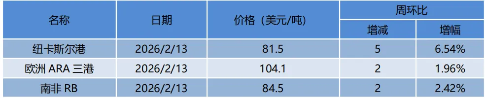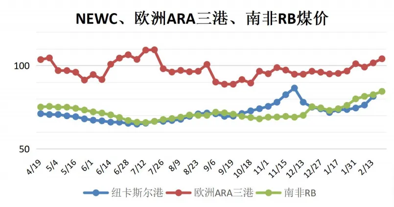 国际煤价呈上涨态势。截至2月13日,纽卡斯尔NEWC5500大卡动力煤FOB现货价格报81.5美元/吨,周环比上涨5.0美元/吨;ARA6000大卡动力煤现货价格为104.1美元/吨,周环比上涨2.0美元/吨;理查兹港动力煤FOB现货价格达84.5美元/吨,周环比上涨2.0美元/吨。