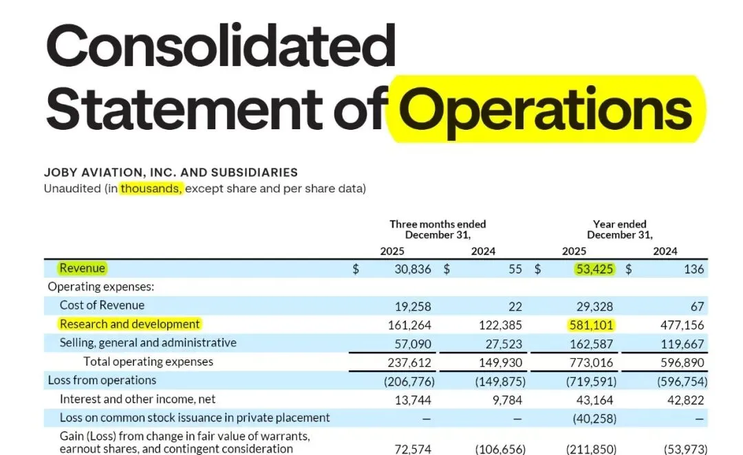 ● 收入。与前一年2024年不同的是,Joby登记了第一个有意义的收入流,5343万美元,尽管这在很大程度上归功于收购Blade,一家已经建立业务的直升机运营商,主要在纽约市。但是,与5.81亿美元的持续研发支出相比,5300万美元这一收入相形见绌。