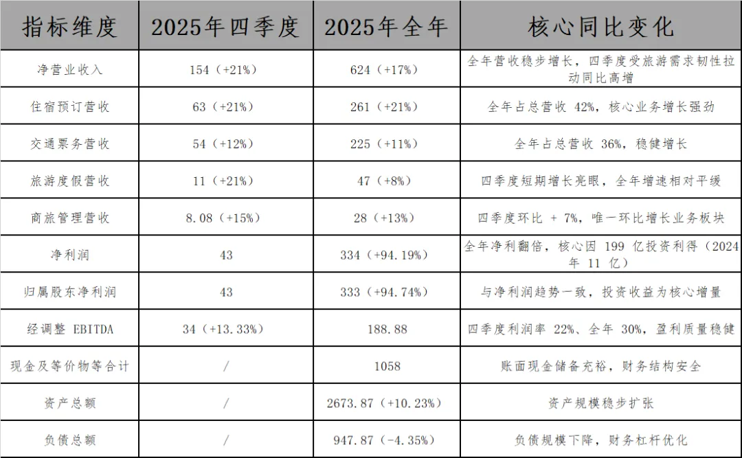 全年营收同比增 17%、四季度增 21%,核心住宿预订业务全年 / 四季度均实现 21% 高增,成为营收支柱;国际业务表现亮眼,OTA 预订同比大增 60%、入境旅客服务达 2000 万人次,印证公司 “全球化” 战略成效显著。商旅管理为唯一环比增长的业务,体现企业端出行需求的持续复苏。2. 盈利端:投资收益推高净利,主业盈利质量稳健