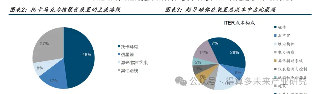 托卡马克主要由环形真空室、磁体和其他辅助设施组成,具有结构简单、造价低,生产周期短,装置迭代快,以及加热成本低等优势,是目前各国投入最大、最接近可控核聚变条件、技术发展最成熟的途径,约占全球核聚变装置的50%。其中,超导材料用于制造超导磁体,超导磁体成本约占装置总成本的30%-40%。不同类型的超导材料占比存在差异,低温超导磁体在装置中的成本占比低于高温超导。参考FIRE项目,ITER反应堆采用低温超导,其超导磁体的价值量占比在28%左右。