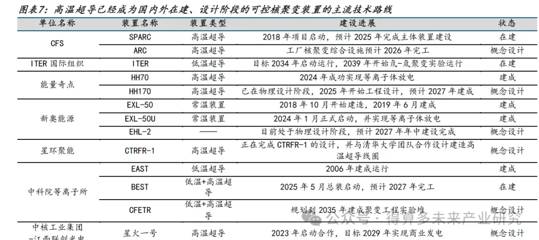 目前国内外新建的(在建/规划设计阶段)可控核聚变装置中,除了1TER采用低温超导,中科院 BEST、CFETR等项目采用低温超导+高温超导外,其余国内外托卡马克装置多计划选用高温超导路线。尤其是在2024年6月,上海能量奇点建造的首台全高温超导托卡马克装置-洪荒70 成功实现等离子体放电,标志着我国在全球范围内率先完成了高温超导托卡马克的工程可行性验证。