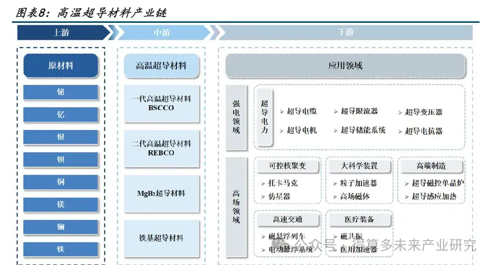 高温超导材料行业处于产业链的中游,是未来能源电力、高端制造等国民经济支柱行业实现产业升级的重要支撑。