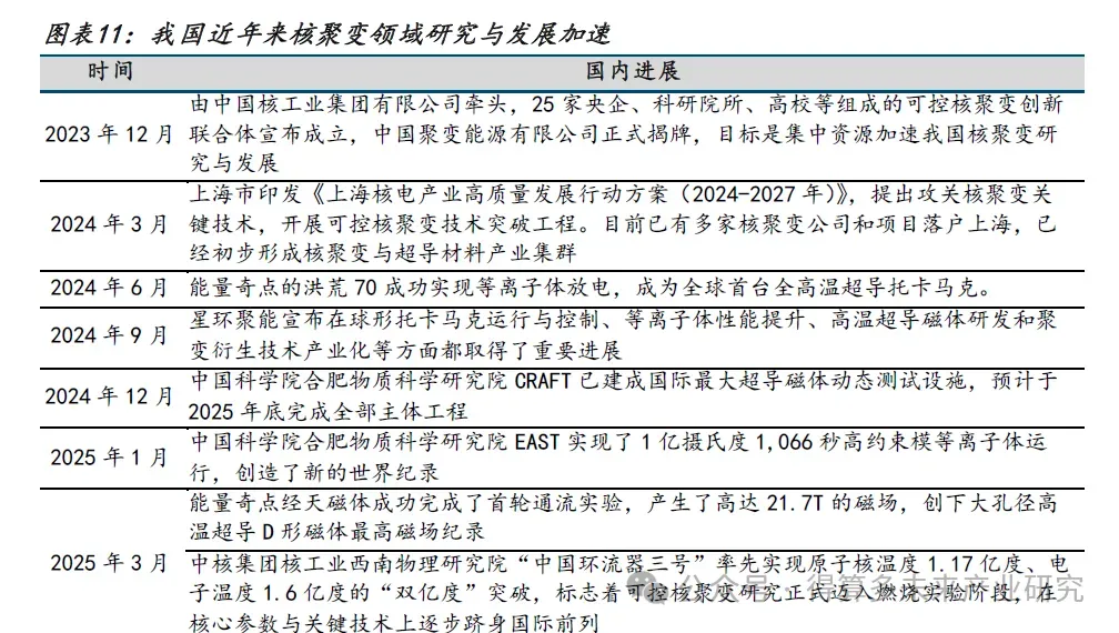 全球可控核聚变的"科技竞赛"加剧。根据核聚变工业协会,截至4M24,全球已有45家商业化核聚变公司,吸引了 71亿美元的投资,其中美国投入最多。国外公司主要包括CFS、TE等。我国对于核聚变的投入从2022年开始加速,2023-2024年每年支出保持在10亿美元左右,追赶态势明显。目前我国商业化核聚变公司主要包括能量奇点、星环聚能等。目前全球大约70%的商业化核聚变公司表示预计在2035年之前能做出第一台商业化的示范堆并完成核聚变发电并网。