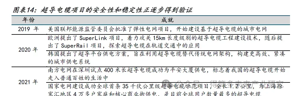 全球各国较为重视超导电缆技术研究,将其列为电力网络未来发展的关键技术之一。例如,2020年欧洲提出了SuperLink项目,着力攻关15km长度级别的超导电缆工程建设技术。我国也高度重视超导电缆产业发展,2021年南方电网在深圳试点400米长超导电缆成功为平安大厦供电;同年12月,国家电网建设成功全球首条35千伏公里级超导电缆示范项目,全长1.2公里,为上海徐家汇地区4万多户家庭和核心商业街供电,是目前全球用户数量最多的超导电缆。从全球范围来看,超导电缆项目的安全性和稳定性正逐步得到验证。