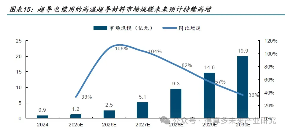 目前超导磁控单晶炉主要采用低温超导技术路线,而高温超导具有一定替代优势。高温超导磁控单晶炉温区更宽,较低温超导磁控单晶炉失超的风险更小。目前,联创超导的高温超导磁控单晶炉已经进入应用推广阶段,整个市场将进入设备换代期。根据赛迪数据,2024年全球用于超导磁控单晶炉的高温超导材料规模为0.6亿元,预计2030年将增长至9.7亿元,2024-2030年CAGR为60.2%。