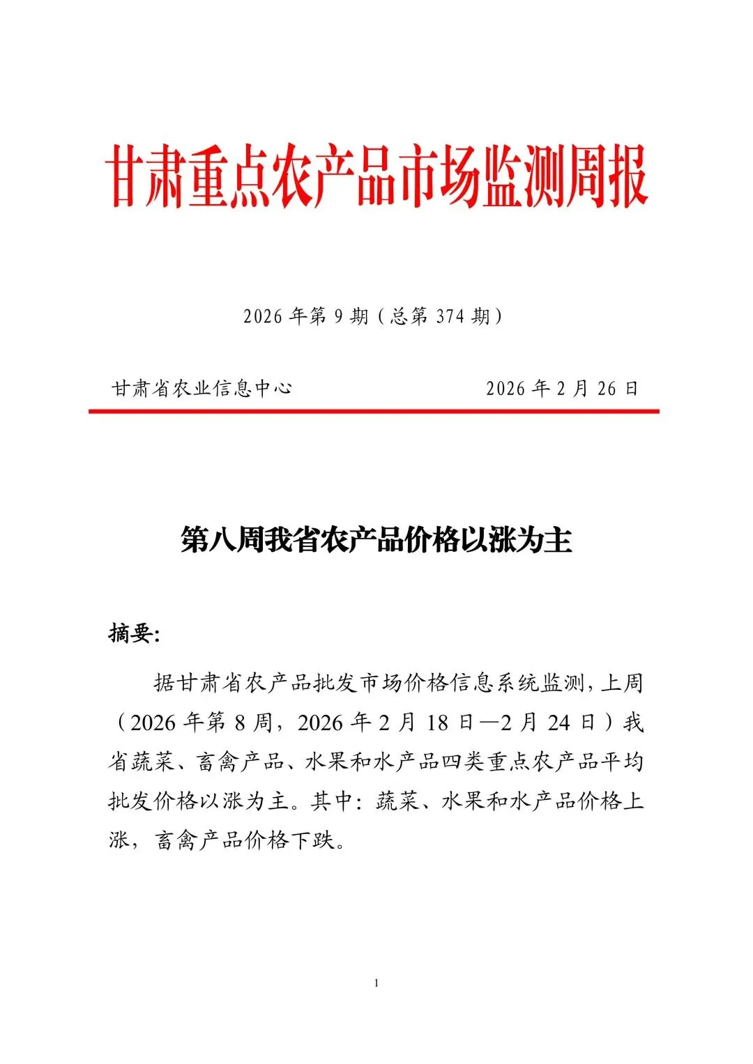甘肃主要农产品市场监测报告【总第三百七十四期】