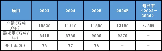 表1.2023~2026年全球PP树脂供需现状及预测表