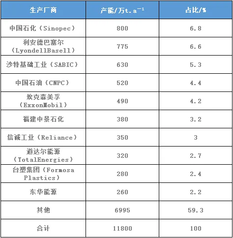 025年全球聚丙烯生产企业前五分别为中国石化,产能800.0万吨;利安德巴塞尔,产能775.0万吨;中国石油,产能520.0万吨;沙特石油公司,产能630.0万吨;印度信实工业,产能288.5万吨。(见表2)