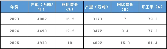 截至2025年底,我国聚丙烯树脂产能达到4939.0万吨/年,同比增长10%;2025年产量为4022.0万吨,同比增长7.0%。(见表3)