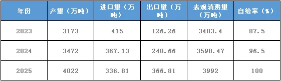 2025年我国聚丙烯表观消费量为3992万吨,同比增长10.9%;自给率100.0%,较上一年增长3.5个百分点。(见表4)