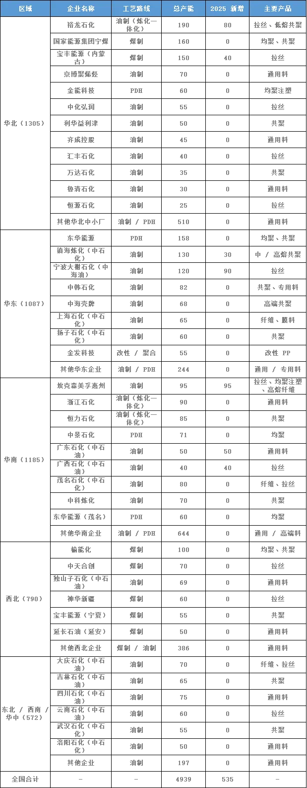 截至2025年,我国生产聚丙烯的企业约80家,总产能4939万吨/年,新增产能主要为浙江石油化工、镇海炼化、中景石化等。(见表5)