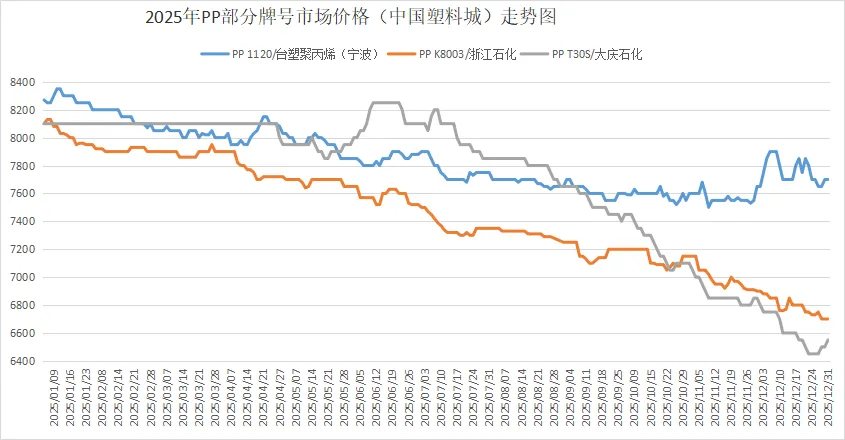 价格方面,2025年,国内聚丙烯价格在6400-8400元/吨。以中国塑料城台塑(宁波)的1120为例,2025年主流价格运行区间在7600-8000元/吨;其中,最高点出现在1月,最低点出现在11月,均价在7855元/吨,较去年均价8318元/吨,跌463元/吨,跌幅5.57%,下跌明显。