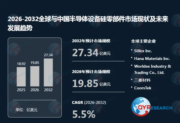 根据QYR(恒州博智)的统计及预测,2025年全球半导体设备硅零部件市场销售额达到了18.92亿美元,预计2032年将达到27.34亿美元,年复合增长率(CAGR)为5.5%(2026-2032)。