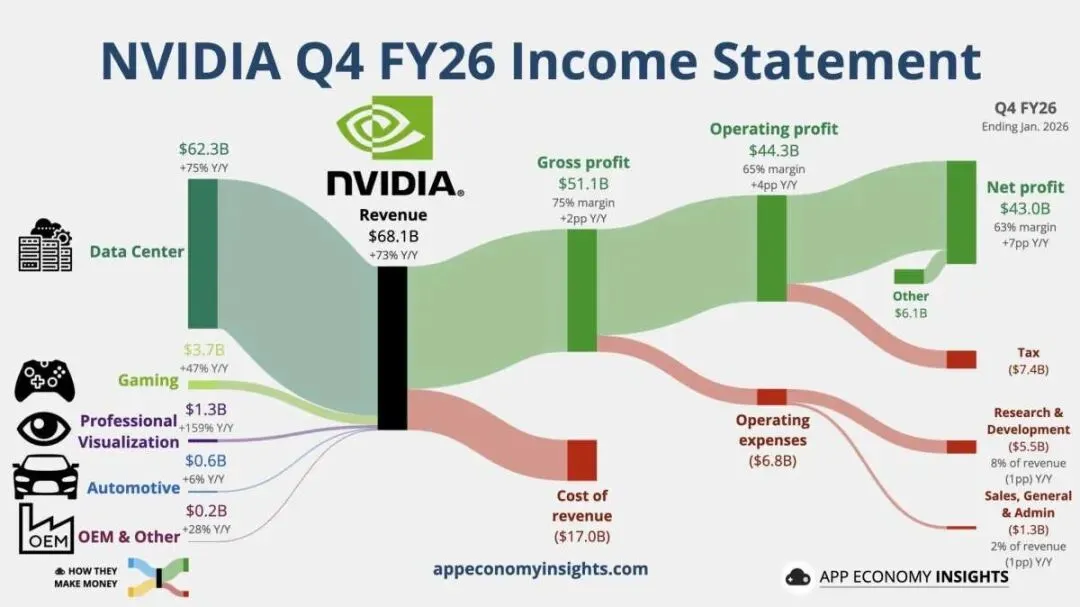 英伟达刚放出的这份2026财年Q4财报,数字漂亮得挑不出毛病,盯着“营收又翻倍”这几个大数看似乎有点审美疲劳,写三点我认为重要的事。