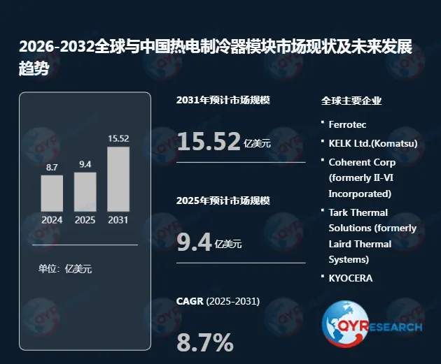 根据QYR(恒州博智)的统计及预测,2025年全球热电制冷器模块市场销售额达到了9.40亿美元,预计2031年将达到15.52亿美元,年复合增长率(CAGR)为8.7(2025-2031)。