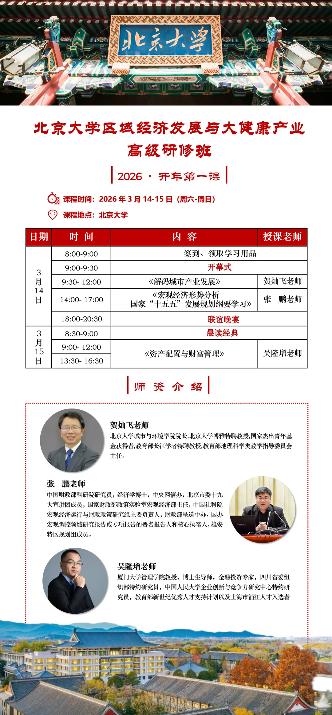 在 “十五五” 规划的开局之年,区域经济与大健康产业正迎来前所未有的战略机遇期。城市更新、产业升级与健康中国战略深度融合,如何精准把握宏观政策脉络,在区域发展中抢占先机?如何将产业趋势转化为可落地的投资决策与财富管理方案?北京大学区域经济发展与大健康产业高级研修班,正是为回应这一时代命题而生的开年第一课。