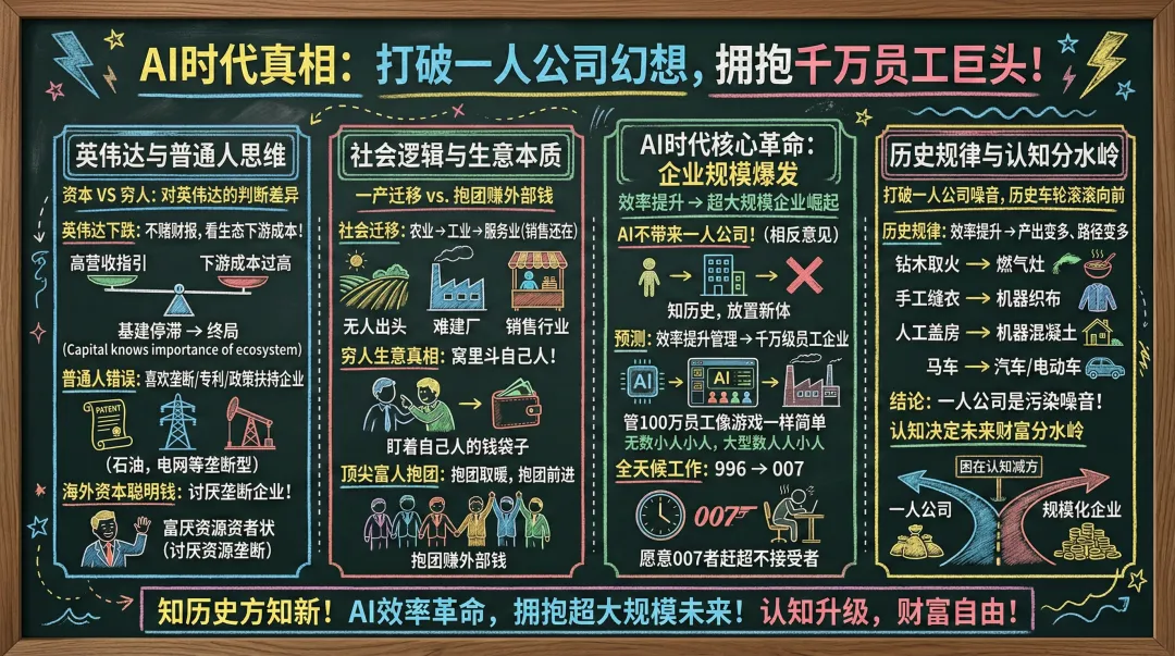 很多人觉得 AI 来了会遍地开花“一人公司”。现实恰恰相反:AI 越繁荣,小公司越难活,巨头越容易吞下世界。AI 带来的不是人人当老板,而是管理效率被指数级放大,从而催生超级组织。最先吃到红利的永远是“能组织的人”。