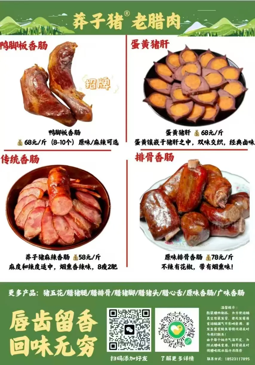 原料:坚守“莽子猪”土猪肉原料,建立“养殖-加工-销售”全链路溯源体系,每款产品附带溯源码,实现“从猪场到餐桌”的全程可查;