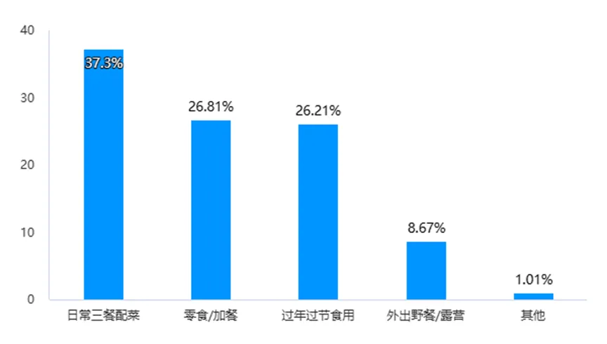 1.消费场景多元化:日常三餐配菜占比37.30%,年节家庭聚餐占比26.21%,休闲零食/加餐占比26.81%,户外野餐/露营占比8.67%,餐饮商用(如火锅、快餐)占比1.01%。数据显示,腊味消费已突破“冬季、节日”的季节性限制,向“全时段、全场景”延伸,与行业“香肠主攻日常高频消费”的趋势一致。