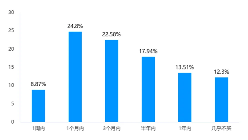2.购买频次与周期:每月购买1-2次占比42.34%,每季度购买1次占比35.08%,仅节日购买占比22.58%。其中,19-25岁群体每月购买频次达1.8次,成为高频消费主力。