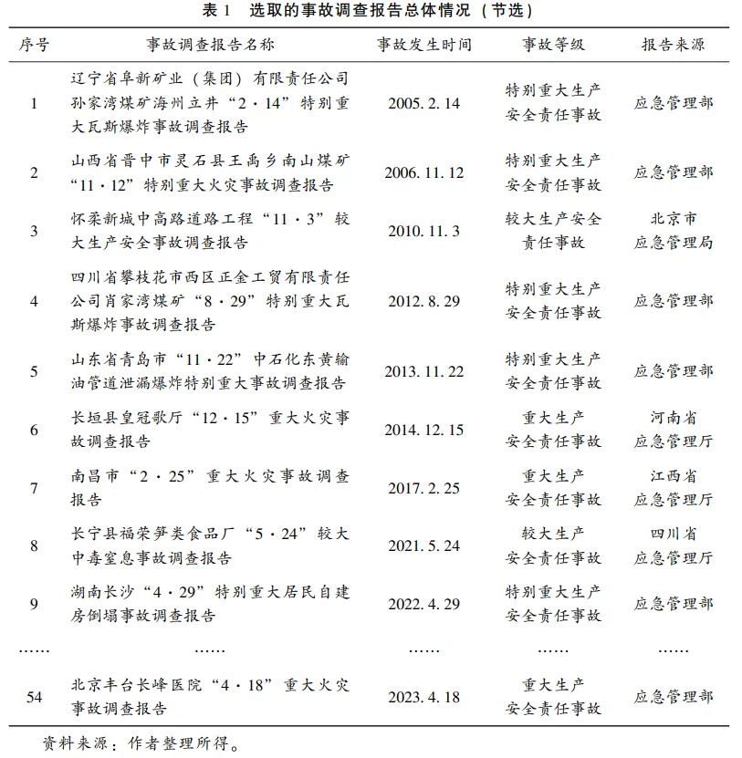 本文用于分析应急响应失灵的数据资料是事故调查报告。事故发生后,为了查明原因、认定事故的性质和责任、汲取相关的经验教训,特定层级的应急管理机构会按照法定程序牵头成立事故调查组。调查组通过现场勘查、问询谈话、回溯分析等方式来复盘事故的发生经过与应急处置情况,形成调查报告,并向社会公布。《生产安全事故报告和调查处理条例》规定,事故调查报告应当包括以下内容:事故造成的人员伤亡和直接经济损失,事故发生经过和救援情况,事故发生的原因、事故性质、事故责任认定,以及对事故责任者的处理建议,等等。作为由权威机构出具的专业技术文件,事故调查报告既为事故归因与行政问责提供了判定依据,也为应急管理工作中的问题整改指明了方向。