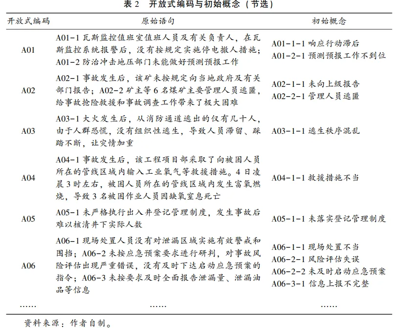 为了识别不同片段中的概念类属,在正式编码之前,本文采用“AXX”的预编码方式来标记54份事故调查报告。如A02表示第2份事故调查报告,用“A2-X”和“A2-X-X”分别表示第2份事故调查报告中被分割出来的第X个语句以及与之相对应的初始概念。