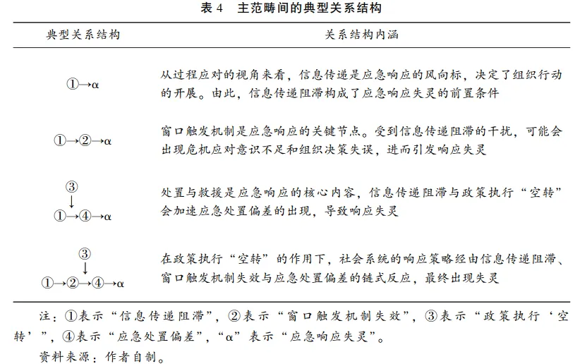 在主轴编码这一阶段,研究者根据问题的语境、过程、结构、功能等要素对初始概念进行聚类,以区分出主范畴和副范畴,为理论模型的搭建提供基本要件。本文遵循主轴编码的规则(即寻找不同类别之间的相关关系)对134个初始概念进行聚类,共得到4个主范畴和10个副范畴(见表3)。表3中的4个主范畴显示了突发事件应急响应失灵的结构性因素,但是主范畴之间是分离的,并未形成逻辑关联。