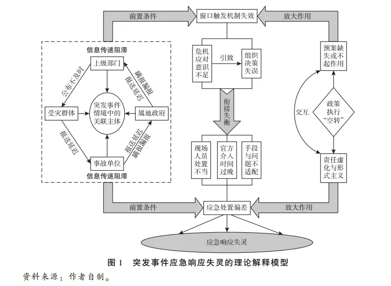 应急响应失灵是一个具有多成因的复杂治理问题。既有研究多局限于科层封闭的视角,强调“让管理者来管理”,未能全面揭示不同诱因条件之间的逻辑关联。为深入剖析其内在的发生机理,论文采用扎根理论方法,基于对54份事故调查报告的三级编码分析,提炼出应急响应失灵的原因链条,并构建综合性的理论解释模型。研究发现,信息传递阻滞、窗口触发机制失效、政策执行“空转”与应急处置偏差构成了响应失灵的四大核心诱因条件。结合具体案例进一步分析发现,在突发事件情境下,信息传递是应急响应的前置条件,上报不及时与瞒报谎报等行为隔断了组织内部的沟通机制,并可能引发连锁反应。窗口触发机制失效与应急处置偏差是响应失灵的关键诱因,且两者间具有传导效应。应急预案、安全管理规定等内容作为响应过程中的约束条件,若是执行“空转”则会放大窗口触发机制与应急处置之间的缺口,加速行动过程与预期结果间偏差的出现。破除和减少突发事件中应急响应的失灵问题,可从“规则-信息-决策-处置”维度出发,加强制度建设与能力培育,以提升组织整体的应急管理水平。