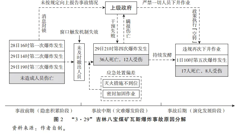 2013年3月29日至4月1日,吉林省吉煤集团通化矿业集团八宝煤业公司(以下简称“八宝煤矿”)采矿区先后发生了5次爆炸,事故共造成53人遇难、20人受伤,带来的直接经济损失达6695.4万元。据应急管理部公布的事故调查报告显示,该事故的救援与处置过程中存在严重的响应失灵问题,包括未按规定向政府有关部门报告并撤出作业人员,违反规定进行应急处置,隐瞒伤亡人员……在对事故调查报告进行系统分析的基础上,本文绘制了原因分解图(见图2),借此对应急响应失灵的理论模型进行具体的内容阐释。