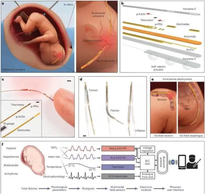 1月26日,西北大学生物电子研究所团队在Nature Biomedical Engineering上发表文章,研发生物电子传感器系统,该系统具有多模式、可操纵的丝状探针,可直接与子宫内的胎儿连接,从而能够对各种生理参数进行可靠和微创的监测。集成的软机器人执行器通过受控导航和力传递确保一致的接触,与精致的胎儿表面形成温和、安全的界面。