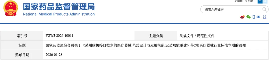 国家药监局发布:《国家药监局综合司关于《采用脑机接口技术的医疗器械 范式设计与应用规范 运动功能重建》等2项医疗器械行业标准立项的通知》