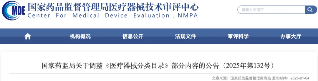 国家药监局器审中心发布:《国家药监局关于调整《医疗器械分类目录》部分内容的公告(2025年第132号)》