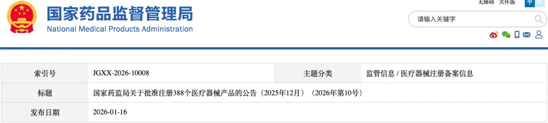 国家药监局发布:《国家药监局关于批准注册388个医疗器械产品的公告(2025年12月)(2026年第10号)》