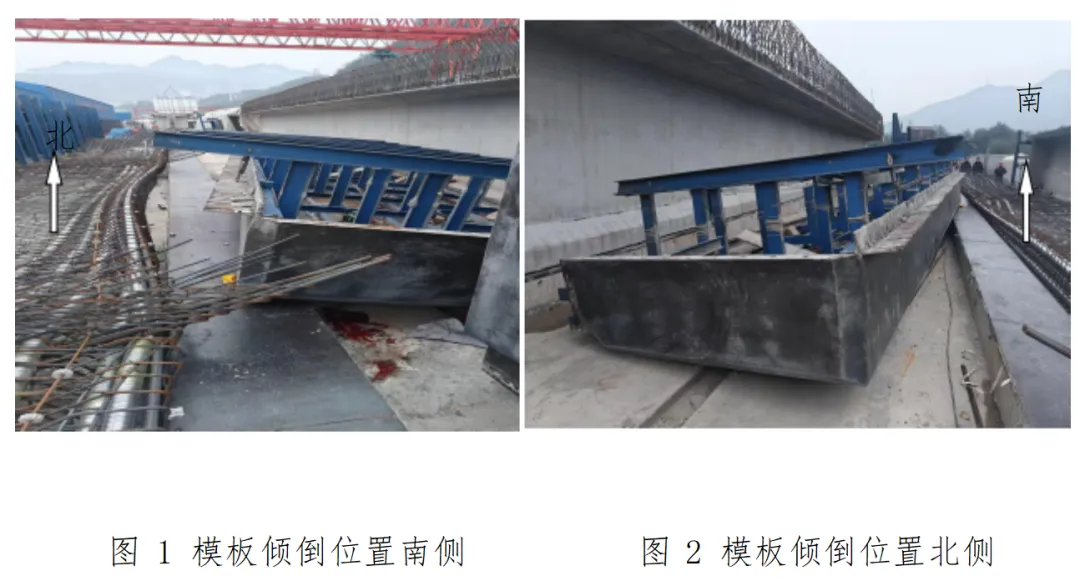 经现场勘查,事发地点位于北京昆仑盛业建设工程有限公司梁场内预制区2号台座。2号台座上钢筋笼向西侧倾倒于地面,台座东侧有2块金属结构模板,北侧模板呈斜向西、倾倒状态,整体未见变形损坏,模板南端面板部分倒在台座台面上,台面处有一个受损安全帽,模板下方地面处有血迹并有一台手持式多功能除锈机。距2号台座约1.7米地面上设有宽约0.2米的排水沟。地面与台座台面均无明显凹坑。倾倒模板长约9.4米、宽约1.4米、高约2.3米,模板底部槽钢与地面接触处有明显划痕。