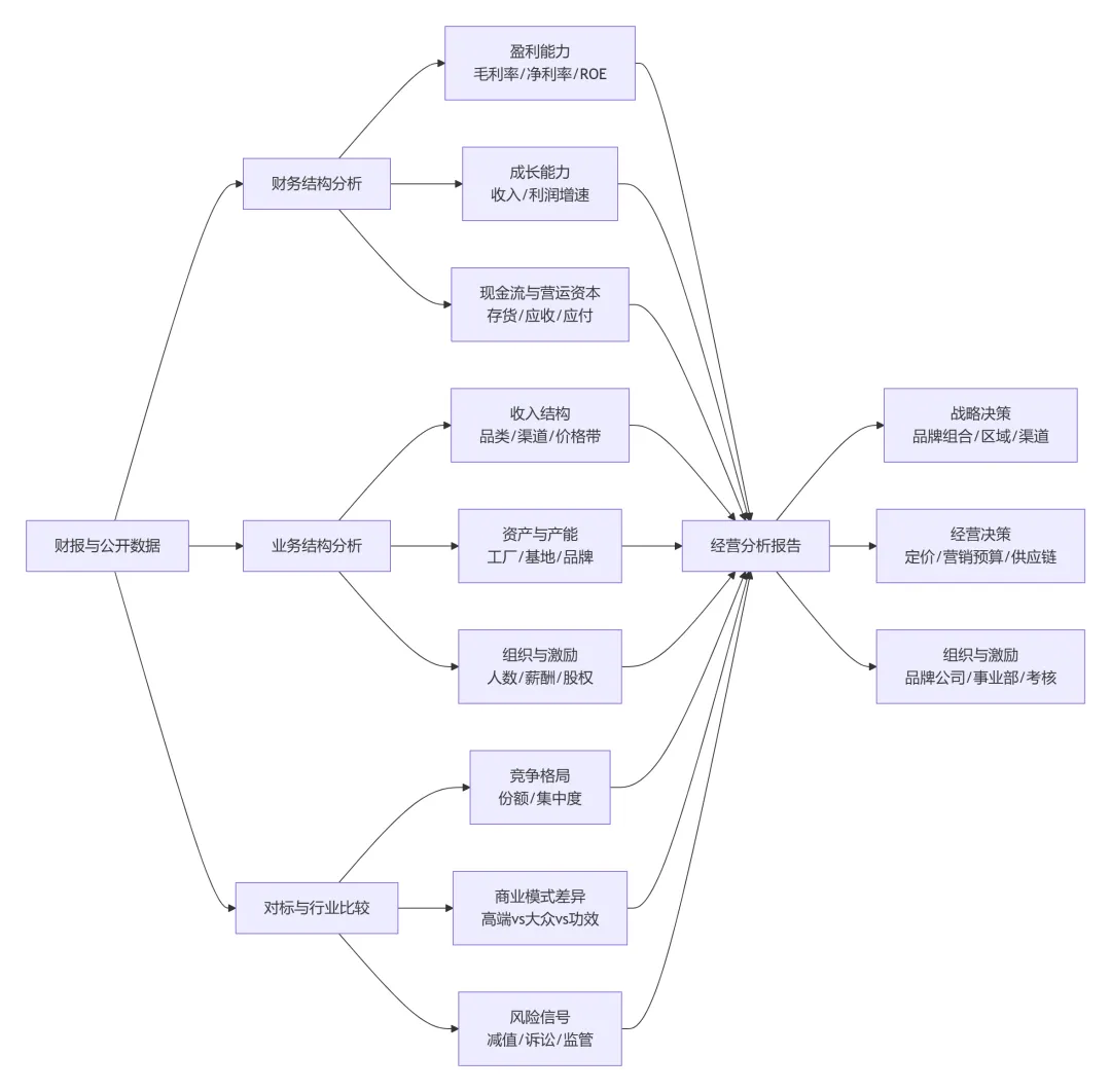 财务结果层(看健康):毛利率、净利率、ROE、自由现金流。 业务驱动层(看动力):分品牌/品类/渠道的收入与利润、新品贡献率、用户复购率。 运营效率层(看内力):存货周转天数、人均营收、单店/单平台投产比。