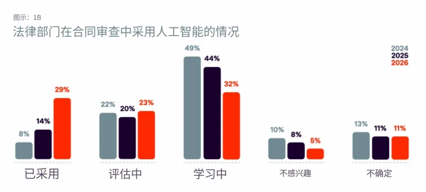 AI采纳率飙升,试点阶段已成过去:企业法务团队对合同审查类AI的使用率已达29%,相较于去年的14%翻了一番,更是2024年(8%)的近四倍。另有超过半数(52%)的法务团队正在使用或积极评估法律AI解决方案。