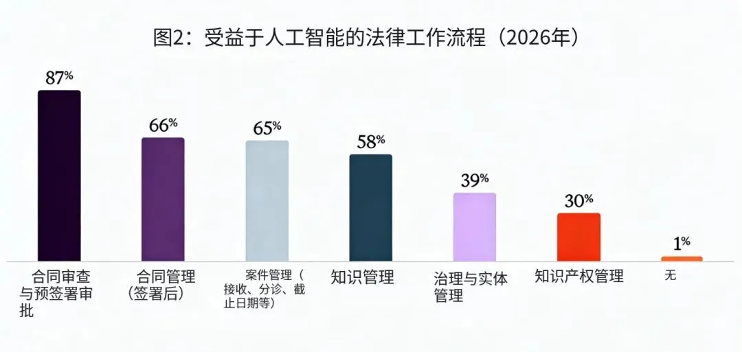 合同审查成为AI应用的核心支柱:面对持续的工作量压力,高达87%的受访者认为AI有助于提升合同签署前的审查和修订效率,使其成为AI应用最广泛、最核心的场景。