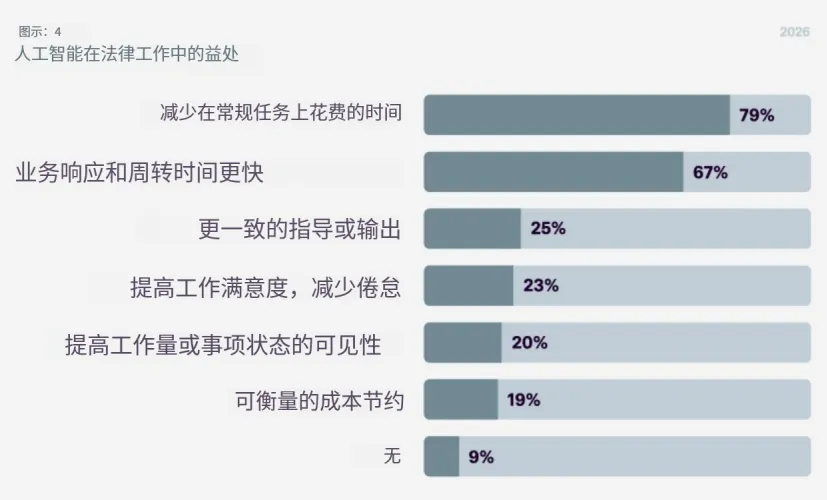 最广泛报告的效益是时间节省,79%的法务团队表示在常规法律任务上花费的时间减少了。这进一步印证了合同审查为何成为AI应用的主要锚点。