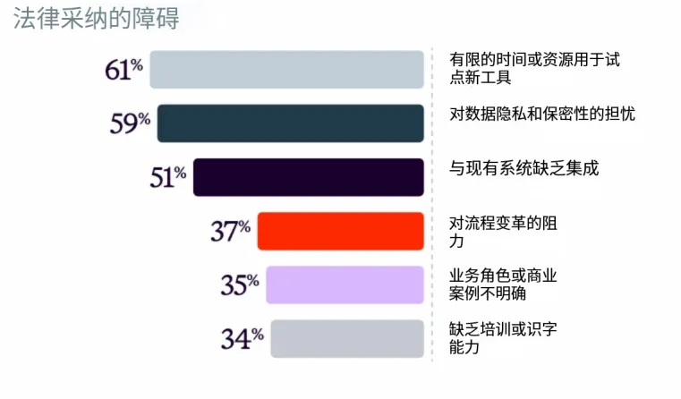 数据隐私和保密性担忧(59%): 随着AI深度融入核心法律工作流程,人们对其安全性、合规性和负责任使用的期望也随之提高。