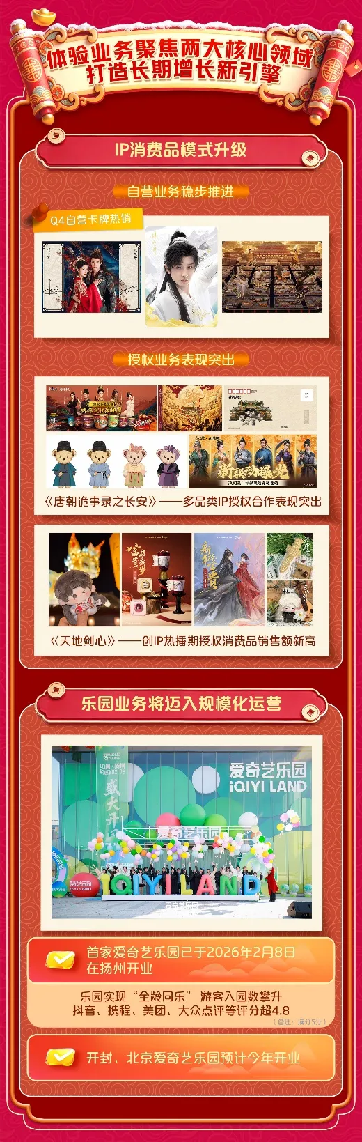 依托丰富的IP资产,爱奇艺正以IP消费品和爱奇艺乐园为核心,将体验业务打造成可持续增长的新引擎。