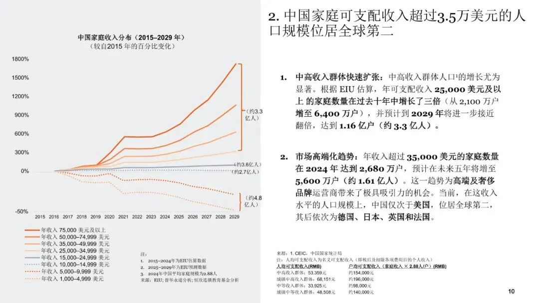 ⦁ 群体规模:2024年,年可支配收入超过2.5万美元的中高收入家庭达6400万户(约1.8亿人),预计到2029年将增长80%,达到1.16亿户(约3.3亿人)。⦁ 购买力:年收入超过3.5万美元的家庭数量预计在未来五年内翻倍,从2024年的2680万户增至5600万户(约1.61亿人),该群体规模位居全球第二。⦁ 储蓄悖论与政策刺激:尽管购买力提升,但受经济放缓影响,消费者倾向于储蓄(银行存款总额达21万亿美元,超过GDP)。为此,政府已实施稳定楼市、加强社保、扩大医保覆盖等举措,以提振信心。预计到2029年,私人消费占GDP的比重将提升3个百分点至43%,每提升1%即对应约1900亿美元的消费增量。