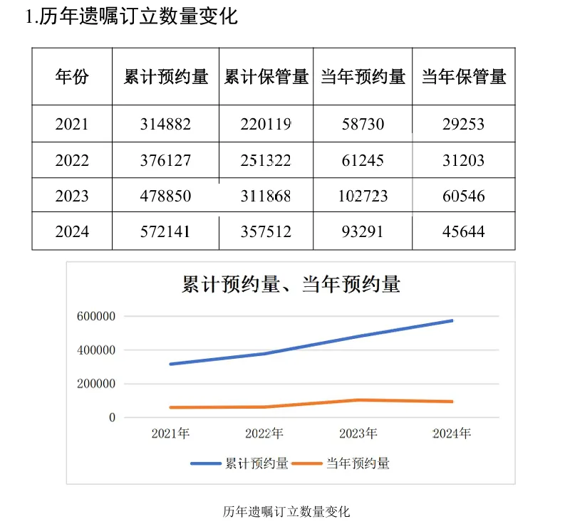 在2021—2024 年间,累计预约量总体呈稳步上升趋势,当年预约量逐渐趋于平缓,截止至2024年底累计预约量高达572141份,主要原因是疫情中后期,人们立遗嘱的意愿逐渐增强,遗嘱观念逐步在国人心中得到广泛认同。