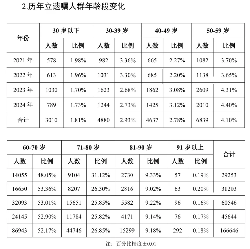 据数据统计,订立遗嘱人群年龄段集中在60至70岁之间,由2021年的48.05%逐步增长至2024年的52.90%,该年龄段人群是订立遗嘱的“主力军”。接着是71-80岁,2024年71-80 岁立遗嘱人占比25.82%。相比而言,中青年群体立遗嘱人较少,30岁以下立遗嘱人只占比1.73%。